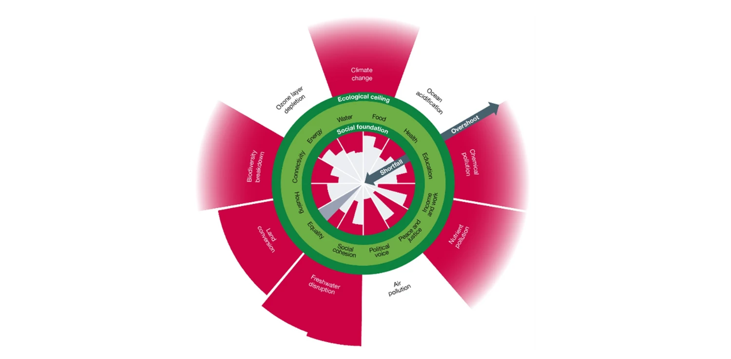 Fondasi Sosial terdiri dari 12 dimensi esensial, mulai dari makanan, air, dan energi, hingga kesetaraan gender, suara politik, dan perdamaian, yang secara kolektif mencerminkan hak asasi manusia universal—menambah wawasan dari 9 batas planetari yang diperkenalkan sebelumnya. Ruang di antara kedua lingkaran konsentris ini adalah “ruang yang aman dan adil bagi umat manusia.” Kerangka ini menantang model ekonomi linier “ambil, buat, buang” dan menggantinya dengan visi ekonomi yang regeneratif dalam desain, yang berarti memanfaatkan energi terbarukan dan mendesain ulang sistem material agar bersifat sirkular, mengurangi limbah hingga nol.