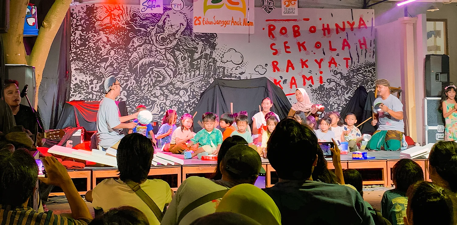 Malam 13 Juni 2025, teater mungil didirikan di lapangan Sanggar Anak Alam (SALAM). Tidak terlalu luas, tapi cukup untuk kami semua dapat duduk dan menyimak dengan saksama panggung sandiwara yang menyinggung soal potret suram dunia pendidikan di Indonesia hari ini, dalam rangka merayakan 25 tahun berdirinya SALAM.
