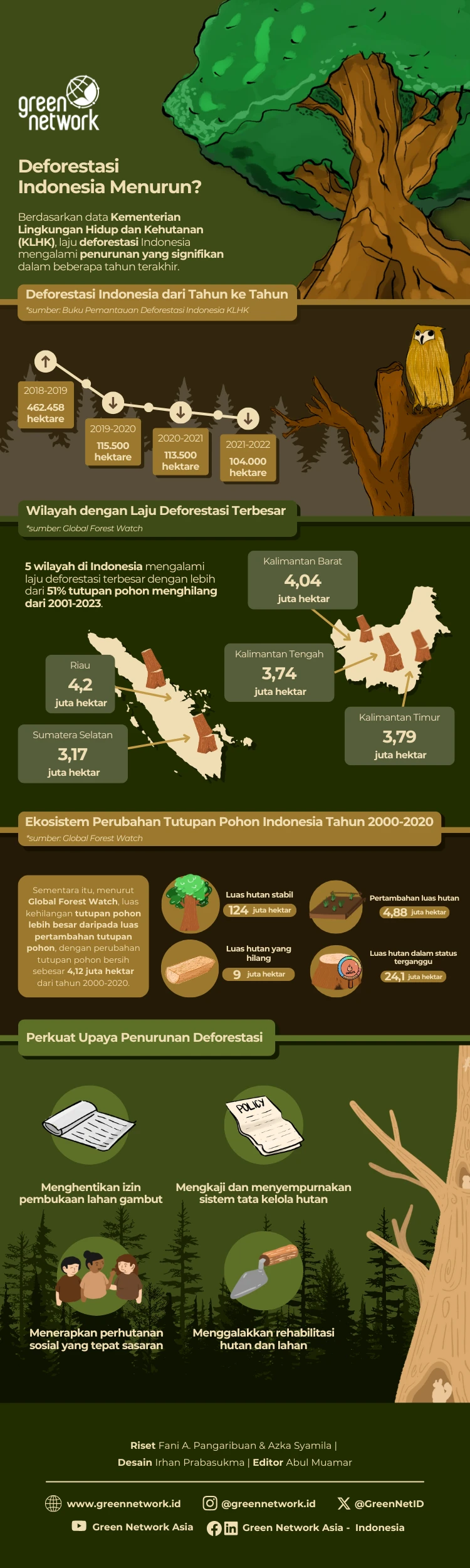 Sementara itu, Indonesia juga mengalami perubahan tutupan pohon dari tahun 2000 hingga 2020, dengan luas hutan yang hilang mencapai 9 juta hektare, sedangkan pertambahan luas hutan sebesar 4,88 juta hektar.