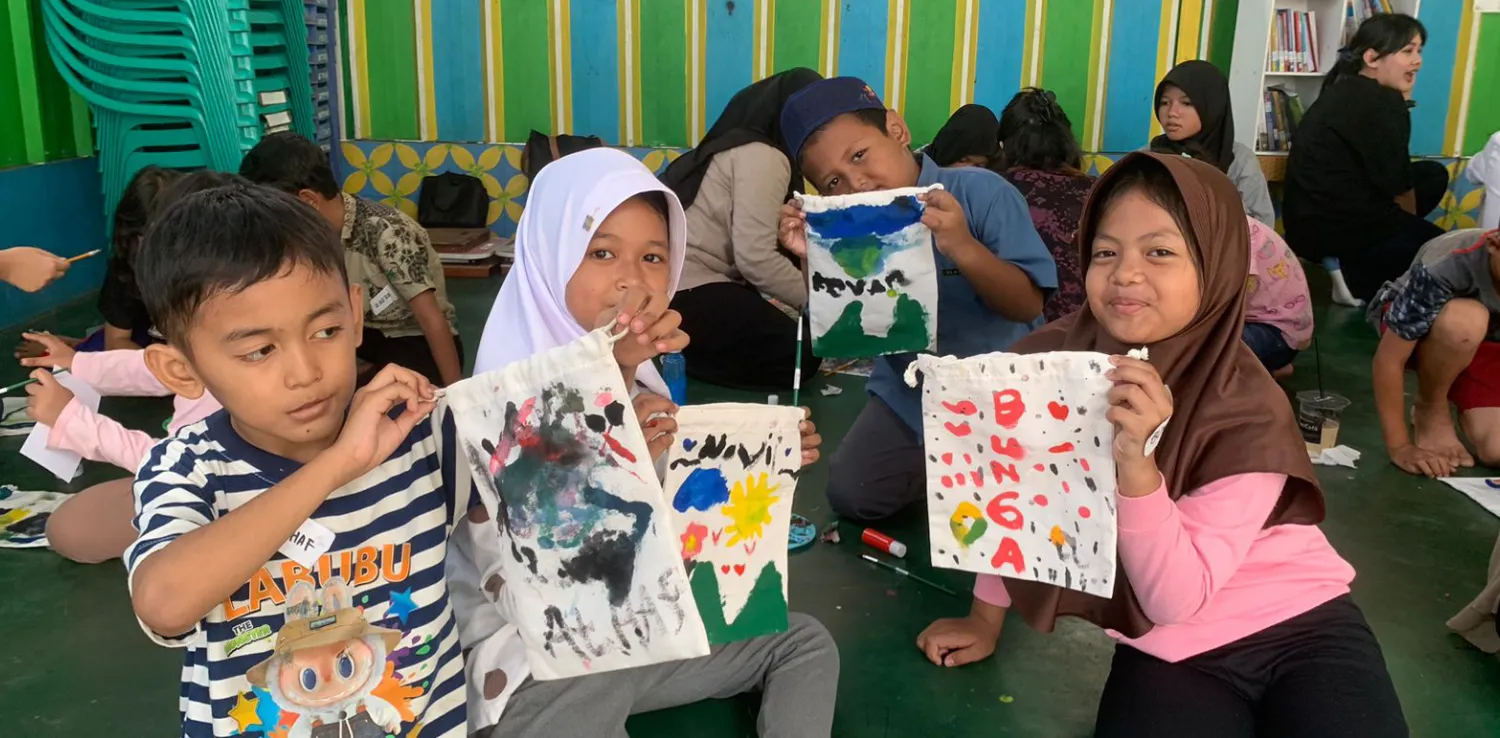 Terakhir, sesi ketiga adalah “Book Pouch Painting”. Setiap anak menghias kantong buku berbahan kanvas polos dengan cat warna-warni. Lewat aktivitas ini, anak-anak melatih kreativitas sekaligus keterampilan motorik halus mereka. Lebih dari itu, kegiatan ini membantu mereka membangun ikatan personal dengan bahan bacaan melalui sentuhan kreatif pada kantong buku mereka.